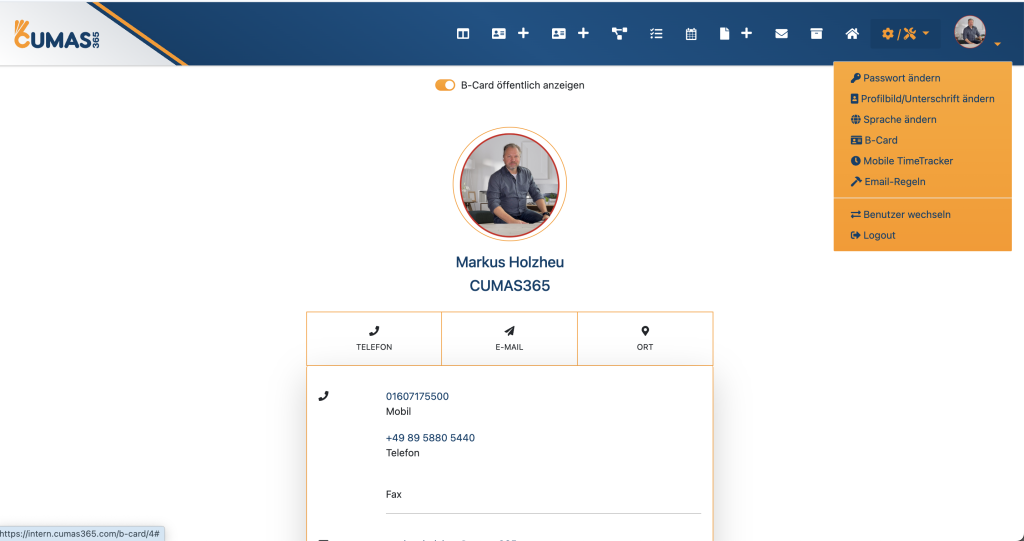 Mit CUMAS365 kannst du digitale Visitenkarten direkt im System erstellen, personalisieren und mit Kunden oder Partnern teilen – DSGVO-konform, sicher und in deinem Unternehmensdesign.