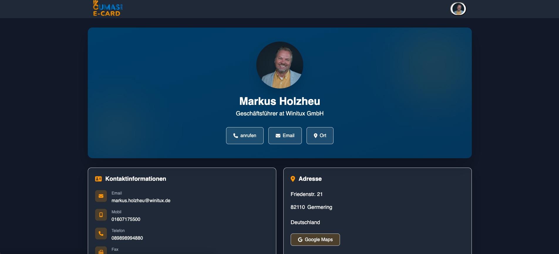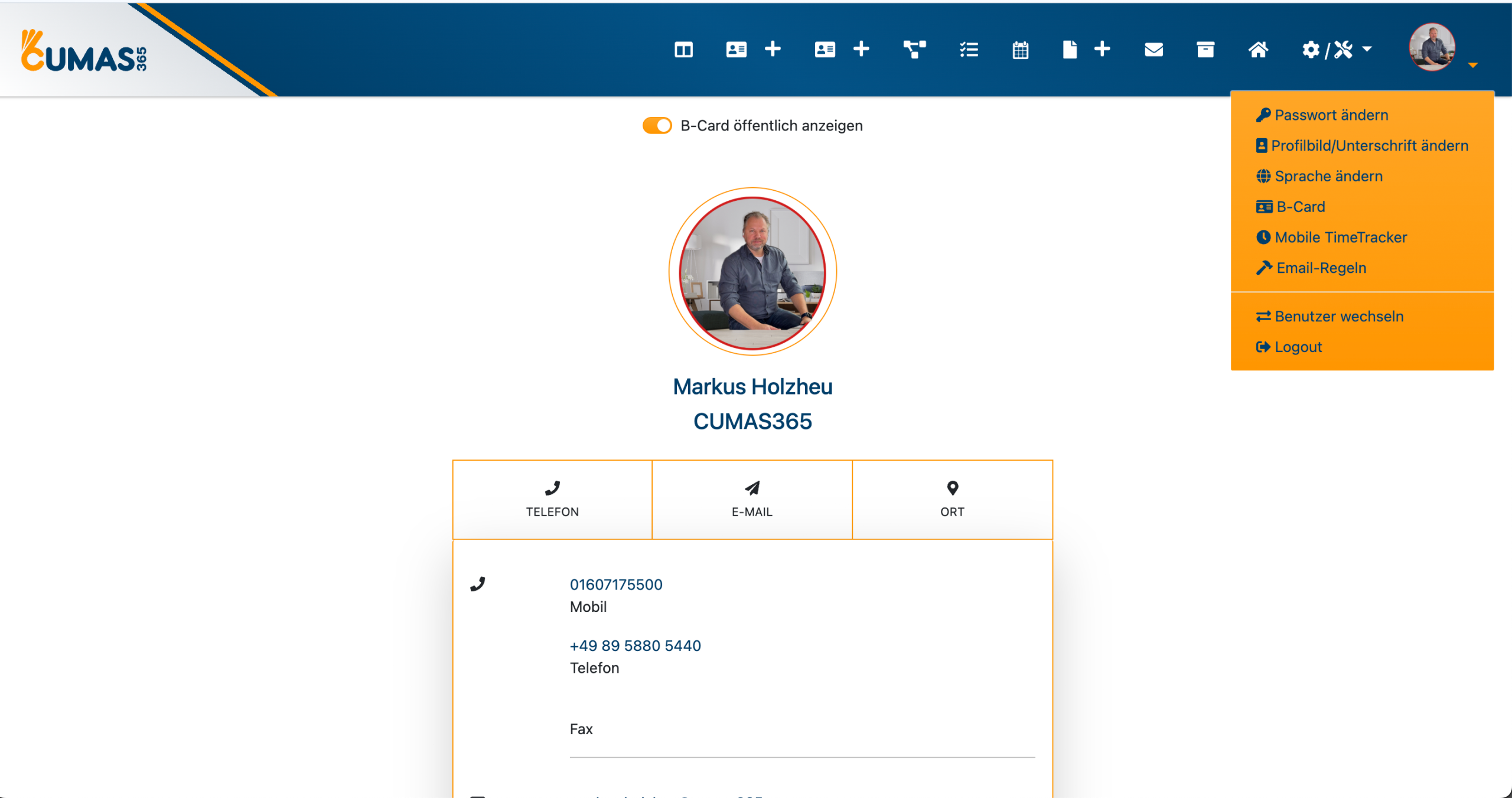 Mit CUMAS365 kannst du digitale Visitenkarten direkt im System erstellen, personalisieren und mit Kunden oder Partnern teilen – DSGVO-konform, sicher und in deinem Unternehmensdesign.